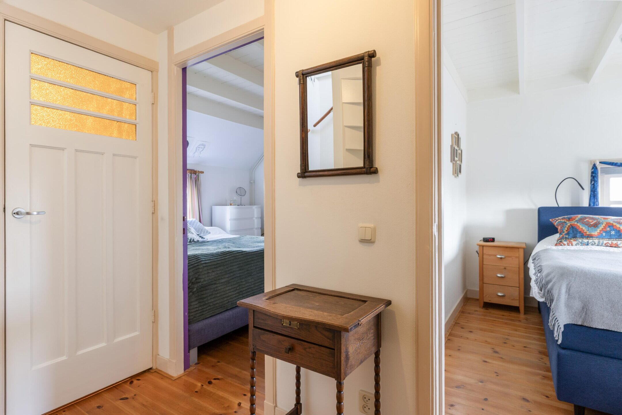 De overloop (hoogte ca. 2,36m.) geeft toegang tot twee slaapkamers en een inloopkastkamer (voorheen de derde slaapkamer). De badkamer is aan de voorzijde gelegen en voorzien van een toilet, douche en wastafel. Beide slaapkamers hebben een raam aan de zijzijde, wat zorgt voor veel daglicht.