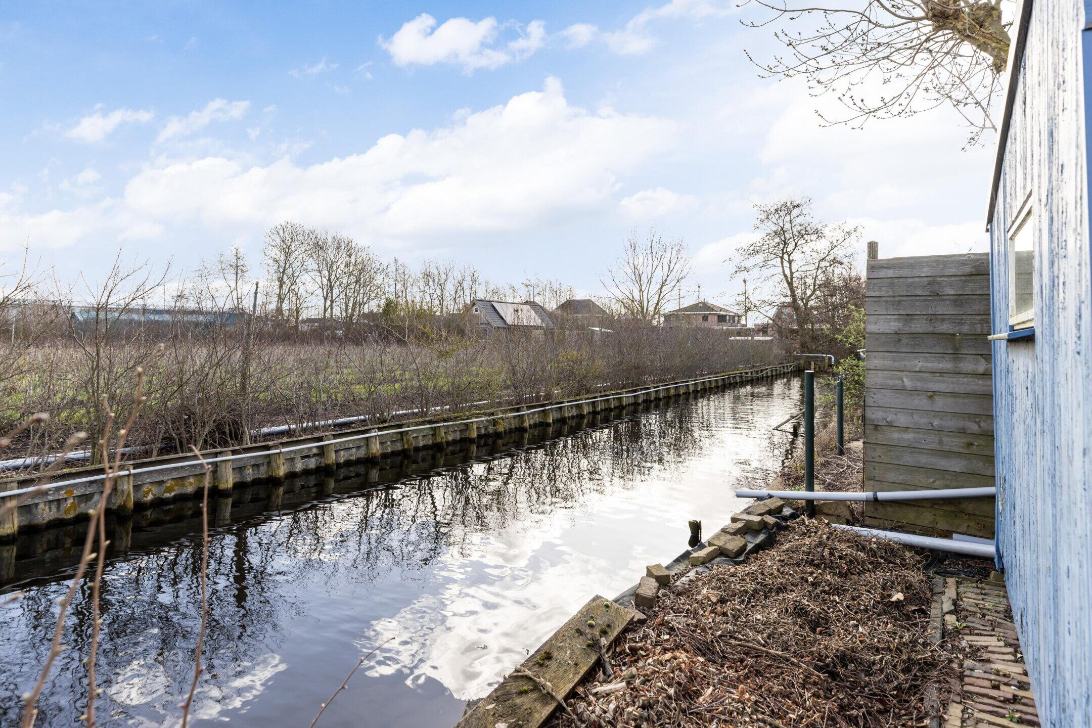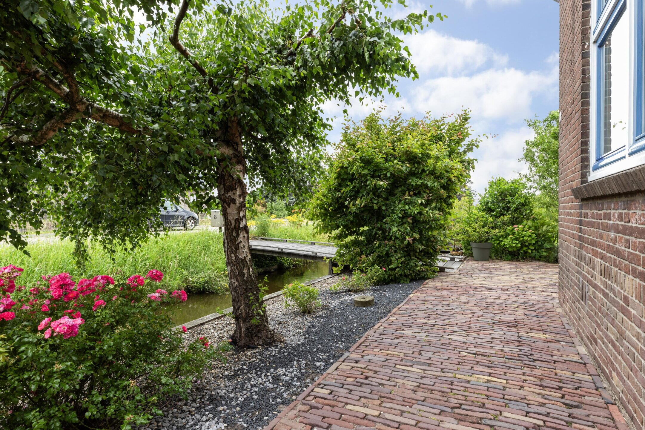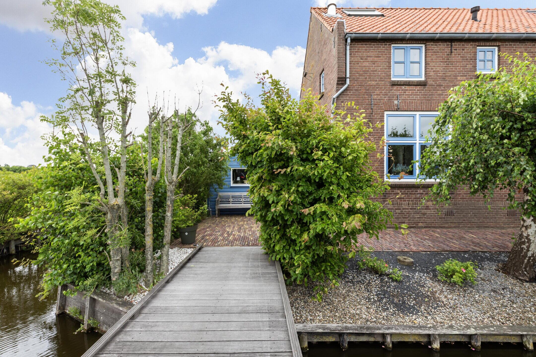 Via het bruggetje bereikt u het perceel. De woning is toegankelijk via de zijzijde aan de achterzijde.