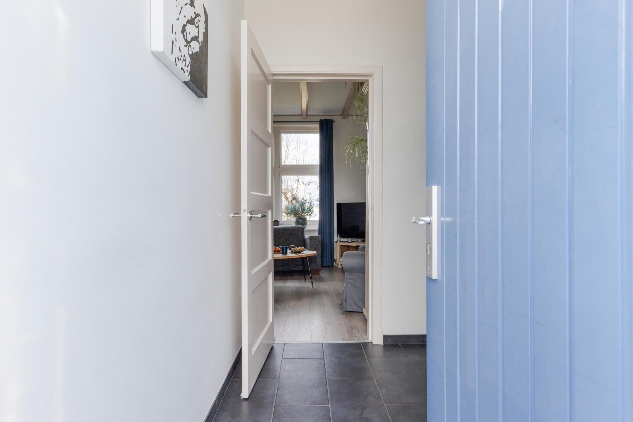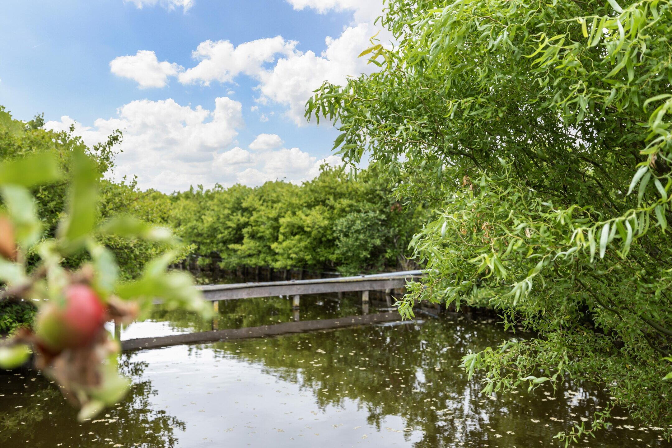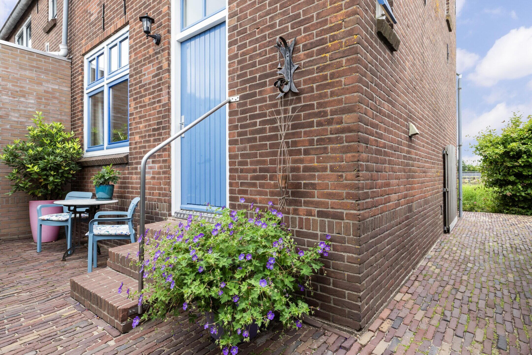 Via het bruggetje bereikt u het perceel. De woning is toegankelijk via de zijzijde aan de achterzijde.