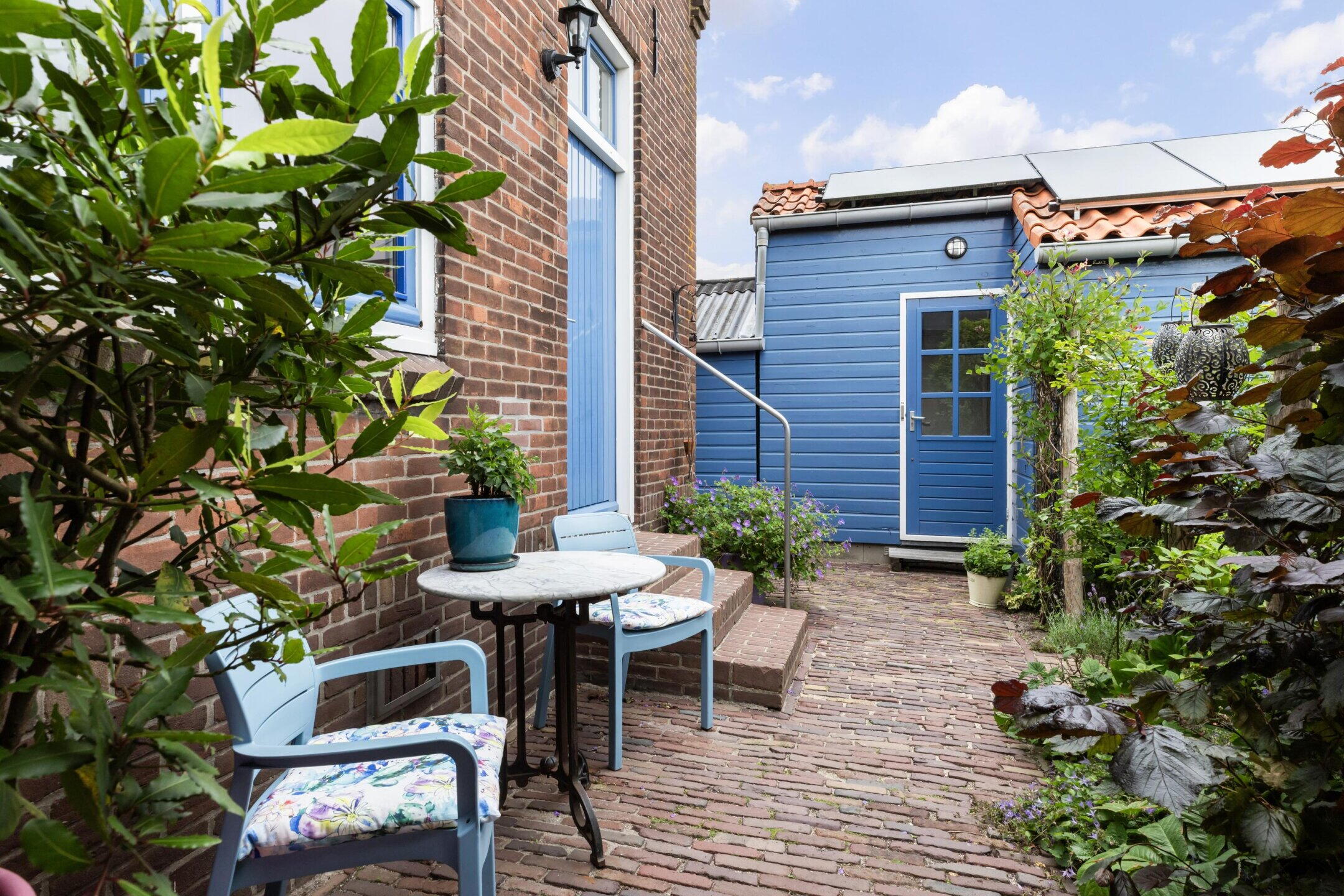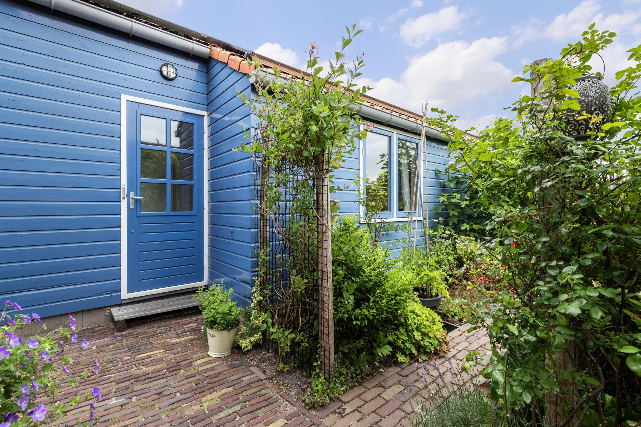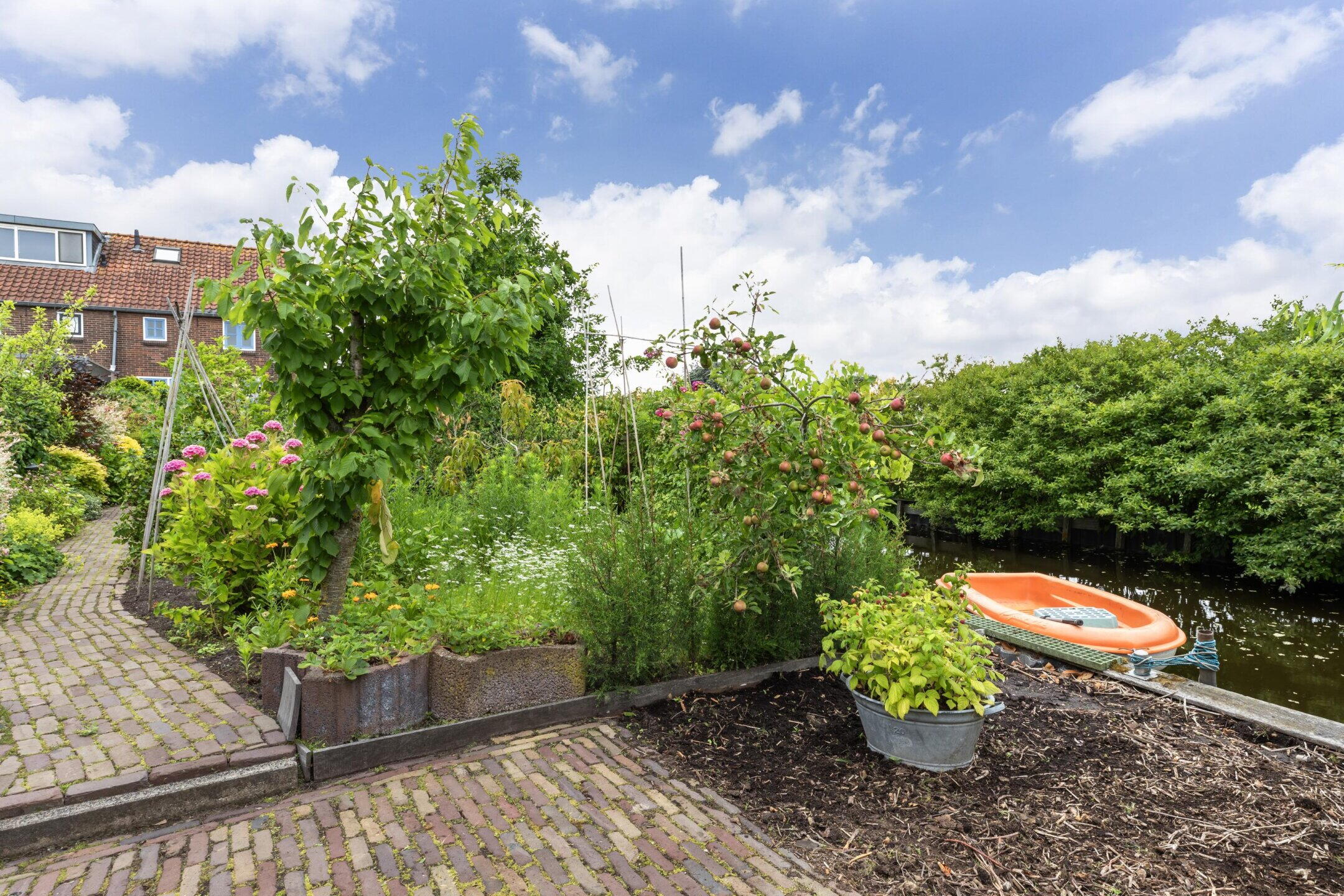 De langgerekte achtertuin van ca. 30 meter diep is een ware groene oase. Aan het breedste punt meet de tuin ca. 10 meter (ter hoogte van het atelier) en loopt naar achteren taps toe tot ca. 7 meter. De tuin bulkt van het groen, is goed onderhouden en voorzien van fraaie sierbestrating en een kleine overkapping achterin. Rondom de tuin ligt water, wat bijdraagt aan het vrije en rustgevende karakter.
