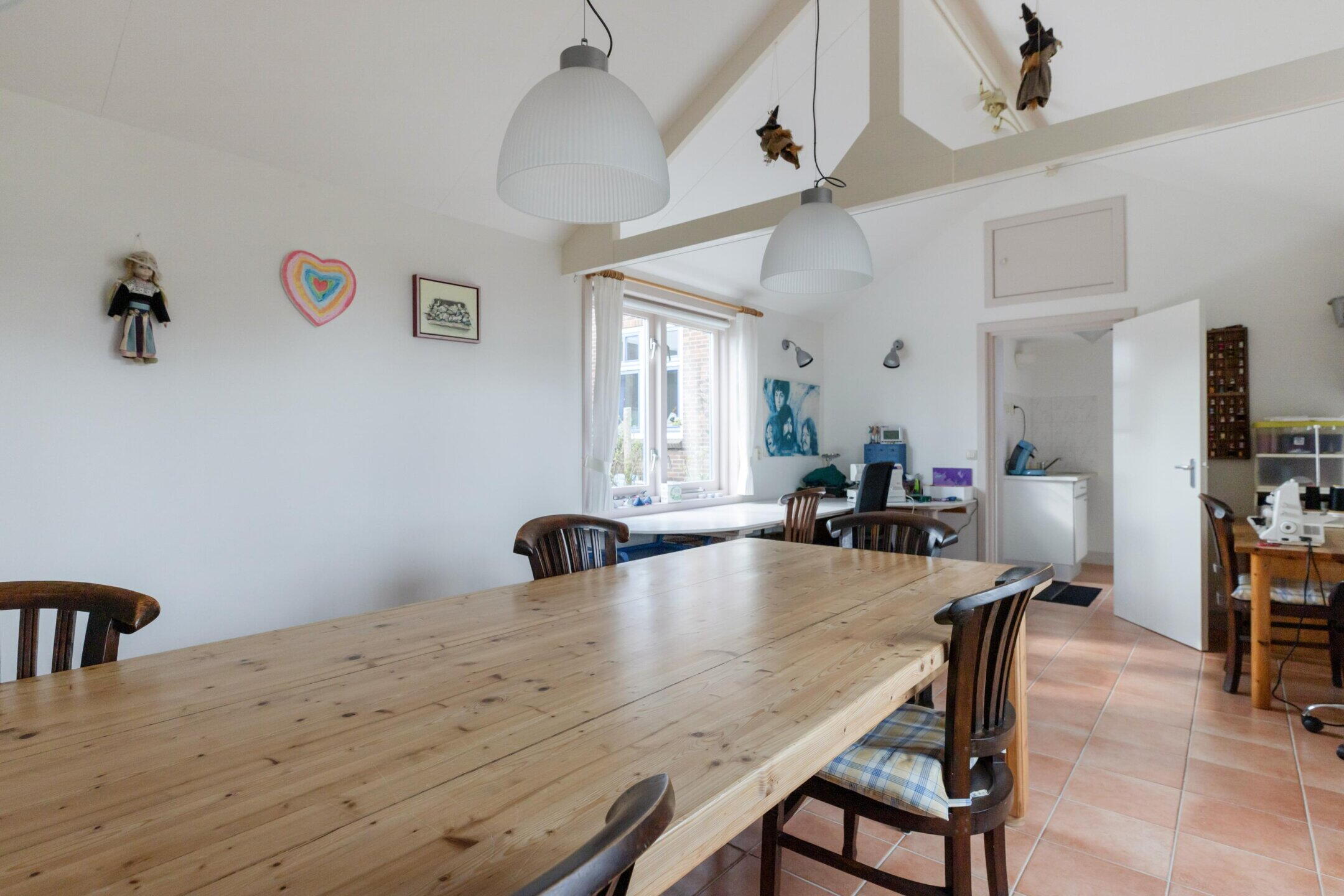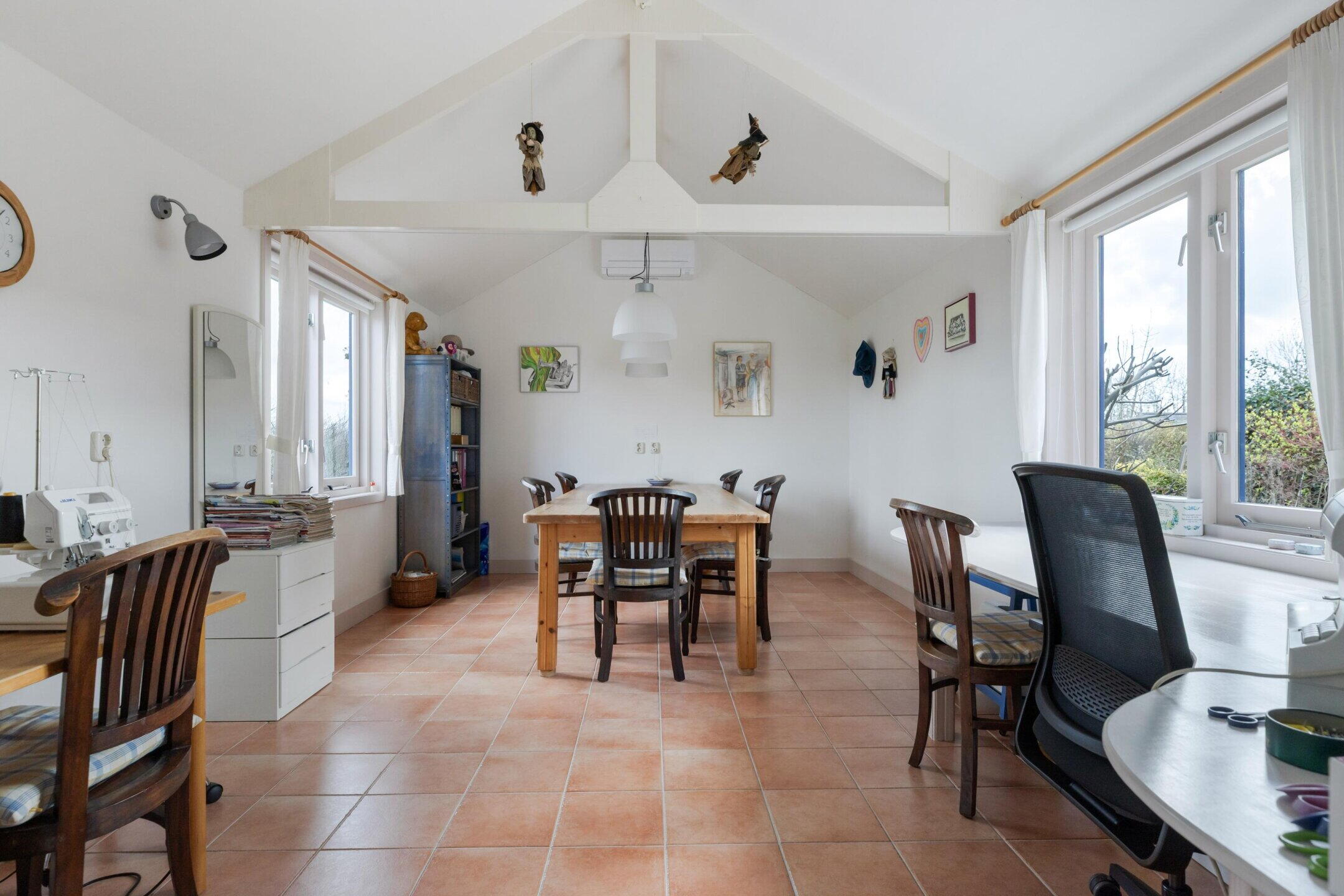 Op het perceel bevindt zich een in de jaren ’90 bijgebouwde atelierruimte, volledig gefundeerd en voorzien van een betonvloer met vloerverwarming, aangesloten op de ketel van de woning. Het atelier heeft een hoge nok van ca. 3,14 m en is toegankelijk via een eigen entree met pantry, toilet met wasbak en een vaste kast. Vanuit de entree is er toegang tot het atelier zelf, voorzien van een zijraam, waardoor veel daglicht binnenkomt. Het atelier is bedekt met pannen en beschikt over 7 zonnepanelen, ideaal voor duurzaamheid en lagere energiekosten. Deze multifunctionele ruimte is uitermate geschikt als hobbyruimte, werkplek of extra woonruimte.